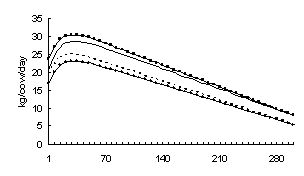 A lenti ábra a tejtermelési időszak (laktáció) ideje alatt termelt tej napi eloszlását mutatja. Bár ezen a diagramon csak 280 napot tüntettek fel, jól látható, hogy az ellést követő pár napban hirtelen növekszik a napi termelés és az idő haladtával egyre kevesebb a kifejhető tej mennyisége. A termelés kiegyenlítettsége nagyon kívánatos volna, hiszen az extrém kilengéseket; nagyon magas kezdeti termelést és gyors visszaesést mutató egyedek tőgye nagyon nagy igénybevételnek van kitéve.