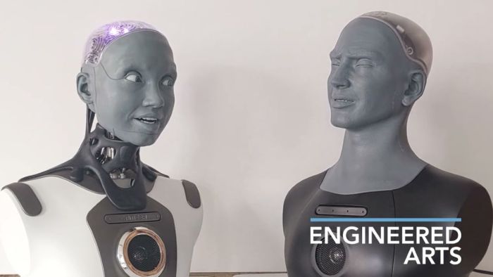 A robotika világában egy új mérföldkőhöz érkeztünk: a világ legfejlettebb humanoid robotja, Ameca, most először társalgott új barátjával, AZI-val.