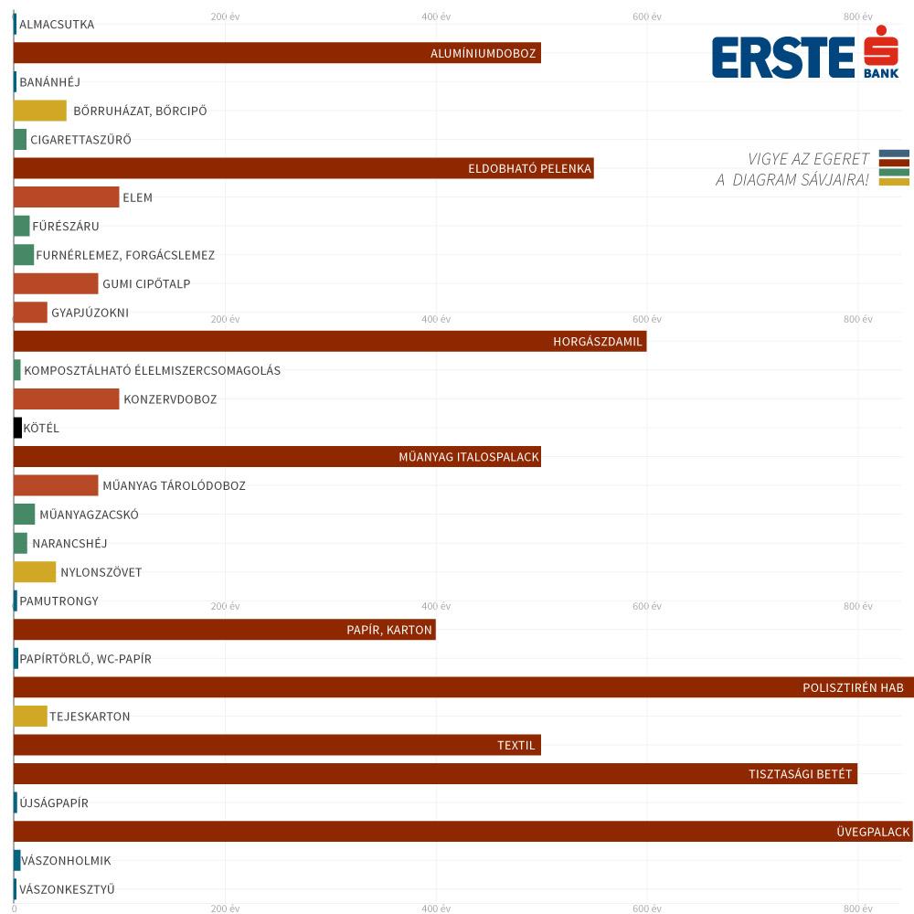 Miért minősíthetnénk nyugodtan a háztartásunkban keletkező (szakszóval kommunális) szemetet veszélyes hulladéknak? Azért, mert többségében válogatás nélkül kerül a kukába könnyen lebomló papír, növénymaradék, ételmaradvány az évszázadok alatt elrozsdásodó konzervdobozzal a gyakorlatilag sosem lebomló üveggel. Ezen az interaktív grafikokon azt mutatjuk meg, egy kuka tartalmából mi mennyi ideig szennyez.