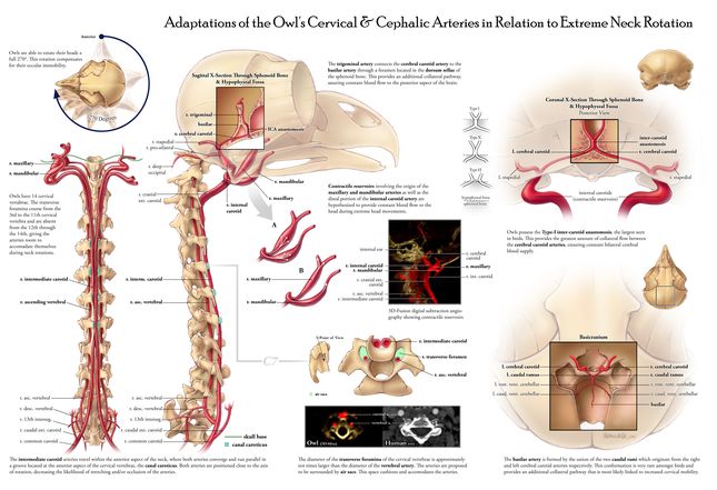 A rejtély megfejtéséhez a Johns Hopkins orvosi illusztrátorokból és idegi képalkotó szakemberekből álló kutatócsoportja természetes okokból elhullott hóbaglyok, szalagos baglyok és amerikai uhuk fejének és nyakának csontszerkezetét és érrendszerét tanulmányozta. Az ereket kontrasztanyag befecskendezésével tették láthatóvá a röntgenképeken.